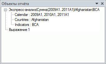 Работа с выражением выполняется с помощью панели «Объекты отчета». На данной панели название элемента, соответствующего выражению, формируется по следующим правилам: