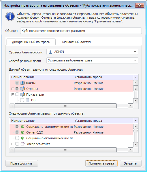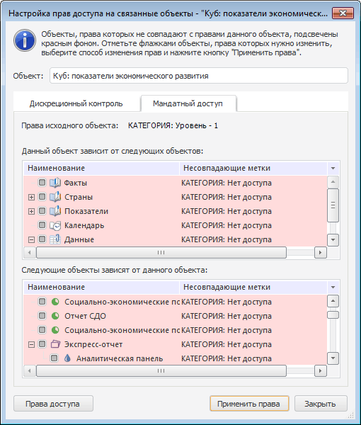 Данный диалог будет открыт, если на одной из вкладок «Дискреционный контроль» или «Мандатный доступ» был установлен флажок «Настроить права на связанные объекты» и была нажата кнопка «ОК». В зависимости от настроенной политики безопасности диалог может содержать вкладки «Дискреционный контроль» и «Мандатный доступ».