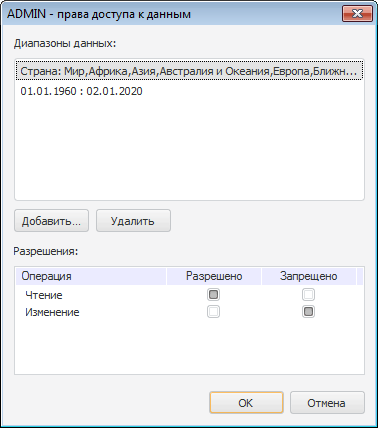 В списке «Разрешения» отображаются права для выбранного диапазона данных. Для разрешения или запрета выполнения определенных действий над диапазоном данных необходимо установить соответствующие флажки напротив выбранных операций.