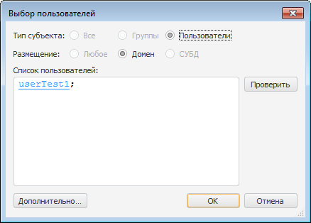 Работа с этим диалогом аналогична работе с диалогом «Выбор групп и пользователей», только будут недоступны для изменения группы «Тип субъекта» и «Размещение».