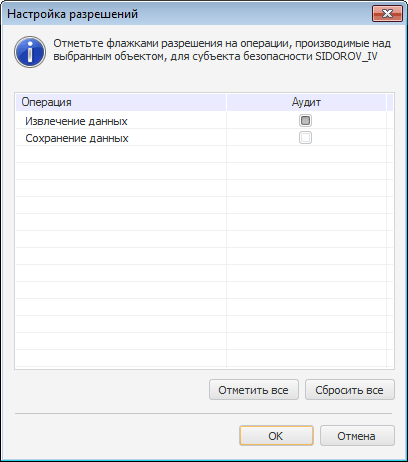 Для настройки аудита по специфическим операциям для объекта нажмите на кнопку «Специфические операции». Данная кнопка будет недоступна, если для данного типа объектов не предусмотрены специфические операции. После нажатия кнопки будет открыто «Настройка разрешений», например: