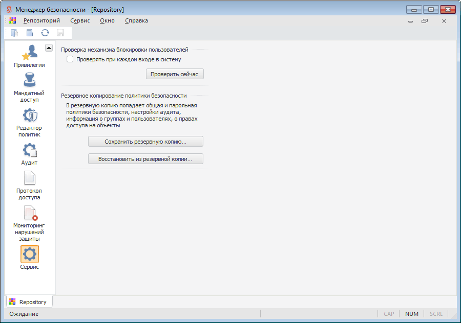 Раздел «Сервис» предназначен для контроля целостности политики безопасности: проверки механизма блокировки пользователей и работы с резервными копиями политики безопасности.