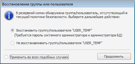 Если выбран вариант «Восстановить», то после нажатия кнопки «Продолжить» будет запрошен пароль системного администратора и администратора сервера БД для восстановления пользователя/группы;