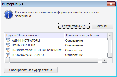 После восстановления политики информационной безопасности выдаётся запрос на обновление пользователей. Обновление пользователей необходимо для корректной работы. В случае положительного ответа происходит запуск механизма обновления пользователей. Окончание процесса сопровождается сообщением о завершении восстановления политики безопасности: