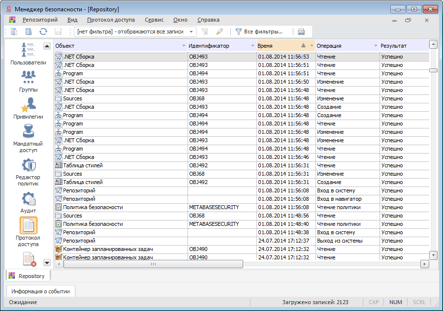 Администратор может отслеживать работу пользователей, используя протокол доступа, который ведется системой. В протоколе доступа отражаются события в соответствии с настроенным аудитом, время и дата происхождения событий, тип событий, имена объектов, имена пользователей.