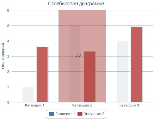 После выполнения примера для созданной диаграммы будет доступно редактирование рисованием. Для редактирования значений ряда необходимо выбрать его в легенде. После этого на диаграмме у выбранного ряда будут выделены точки, при движении курсора мыши над диаграммой будут затемнены области каждой точки ряда. Для изменения значения точки необходимо зажать левую кнопку мыши и перемещать указатель по вертикали. Не отпуская кнопки мыши, можно продолжить редактирование соседних точек. Рядом с курсором будет отражаться новое значение точки: