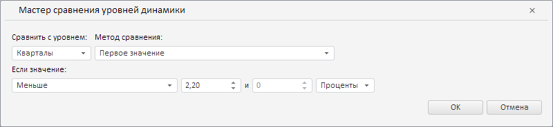 В результате выполнения примера в данном мастере был установлен уровень «Кварталы», метод сравнения «Первое значение» и операция сравнения «Меньше 2,20%»: