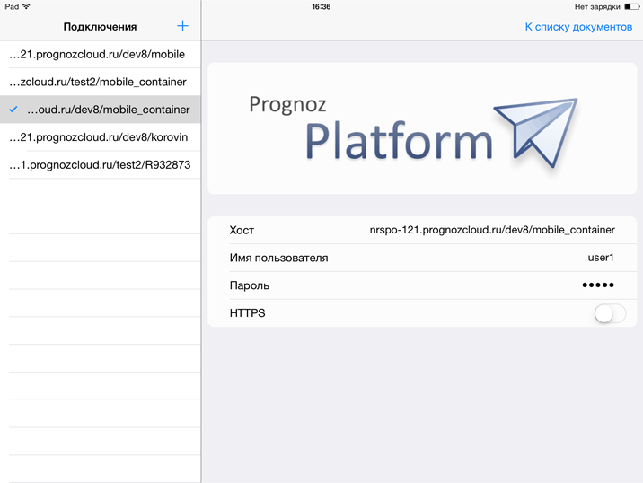 Для подключения к серверу нажмите кнопку «К списку документов» или дважды нажмите на сервер в списке подключений.