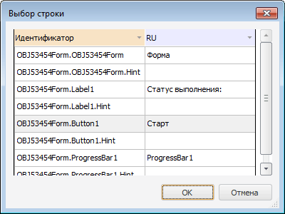 В диалоге содержатся все строковые элементы ресурсов, подключенных к форме. Для каждого элемента ресурсов отображается значение идентификатора и значение для языка по умолчанию. После выбора нового строкового элемента необходимо нажать кнопку «ОК».
