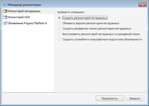 Обновить версию репозитория метаданных. С выходом новых версий Prognoz Platform 8 состав репозитория может изменяться. Для использования новых возможностей может потребоваться обновление версии репозитория. Автоматическое изменение системных таблиц производится на основе информации, находящейся в файле с расширением *.rm4, в котором хранятся исполняемые скрипты. Данный файл входит в стандартный установочный пакет и находится по пути «S\Rm\current.rm4», где S - путь до места установки Prognoz Platform 8. Данная функция используется для обновления системных таблиц Prognoz Platform 8 в соответствии с изменениями и улучшениями, произошедшими в исполняемом модуле Prognoz Platform 8;