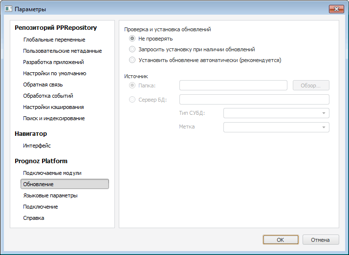 Установить обновление автоматически (рекомендуется). Если в источнике обнаружена более поздняя сборка, то обновление будет происходить автоматически при запуске Prognoz Platform 8, без каких-либо запросов;