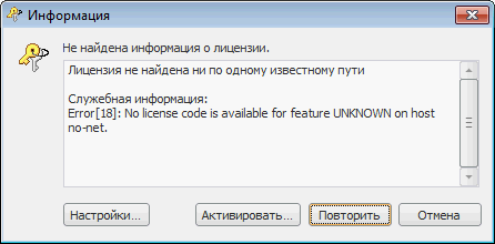 Настройки. Открывает диалог с настройками поиска лицензии, после его закрытия выполняется повторный поиск лицензии с учётом сделанных изменений.