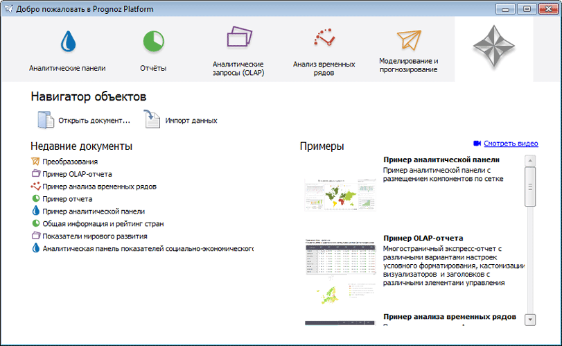 Начните знакомство с Prognoz Platform 8 с просмотра готовых примеров или видеороликов. Каждая вкладка окна приветствия содержит готовые примеры по основным инструментам Prognoz Platform 8: