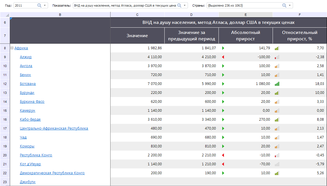 Готовый отчет динамически изменяется, используя элементы управления для выбора наблюдаемого года, показателя и списка стран. При клике по заголовку страны будет совершен переход на второй лист, отображающий информацию по нескольким показателям для выбранной страны.
