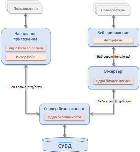 Клиентская Prognoz Platform 8 через веб-сервис подключается к серверу безопасности и передает идентификатор требуемого репозитория, настроенного на сервере безопасности. Далее все запросы от клиентской Prognoz Platform 8 к базе данных проходят через сервер безопасности, который сам формирует запросы к базе данных. При использовании веб-приложения в конфигурацию добавляется BI-сервер, выполняющий функции ядра бизнес-логики.