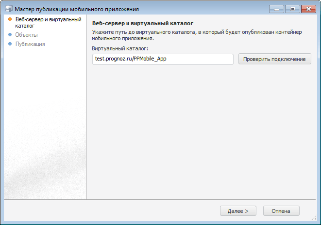 Будет открыт мастер публикации мобильного приложения, содержащий следующие страницы: