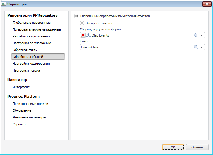 Задание параметров обработчика событий для экспресс-отчётов осуществляется на вкладке «Обработка событий» диалога «Параметры».