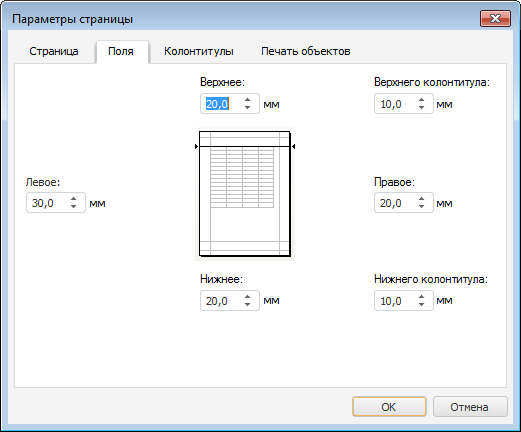 Настроить поля страницы, которые будут отображаться при печати, можно в диалоге «Параметры страницы» на вкладке «Поля». Для открытия диалога выполните команду главного меню «Экспресс-отчет > Печать > Параметры страницы».