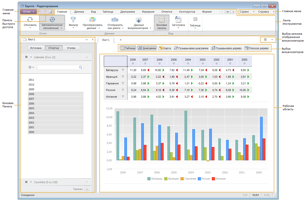 Лента инструментов сдержит команды, упорядоченные в логические группы, размещенные на вкладках. Некоторые вкладки выводятся на экран только по мере необходимости. Например, вкладки «Диаграмма» и «Карта» отображаются, если в рабочей области активен соответствующий объект.