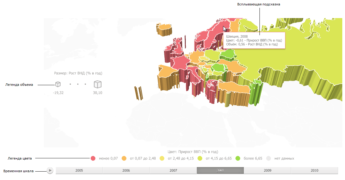 На рисунке ниже приведена карта с легендами цвета, объема, всплывающей подсказкой и временной шкалой: