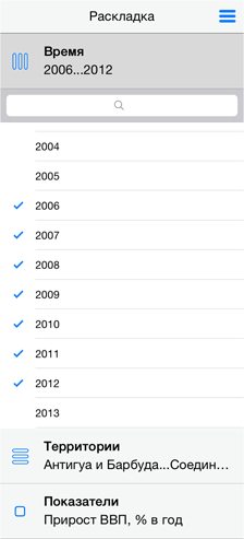 Панель измерений состоит из вкладок, каждая из которых представляет собой одно измерение. При нажатии на заголовок вкладки открывается список элементов.