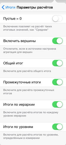 Включить вершины. Включает в расчет итогов значения вершин. Если для исходного отчета была настроена агрегация, то эту настройку нужно отключить;
