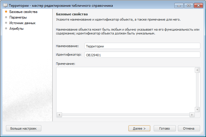 На странице «Базовые свойства» задается наименование объекта, идентификатор и примечание.