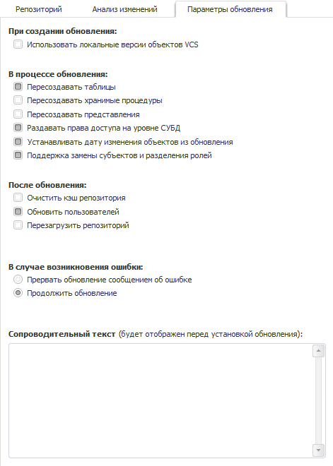 Продолжить обновление. При возникновении ошибки обновление будет продолжено без выдачи сообщений. Исключением являются ошибки о невозможности обновления объекта. В данном случае все равно появится сообщение. Продолжить обновление будет можно, только отреагировав на сообщение.
