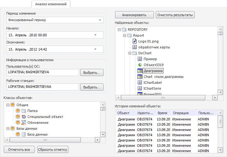 Результаты анализа будут отражены в списке «Найденные объекты». При выборе объекта в списке найденных в таблице «История изменений объекта» будет отображена информация об изменениях объекта: наименование и идентификатор, дата и время, операция, пользователь.