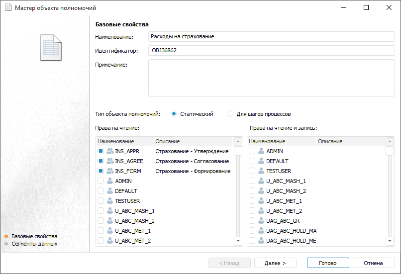 Объект полномочий используется для выбора пользователей/групп пользователей, типа прав доступа (чтение/чтение и запись) и задания сегмента данных, на которые указанные пользователи будут иметь выбранные права. Созданный объект полномочий определит статические права доступа к указанным сегментам данных.