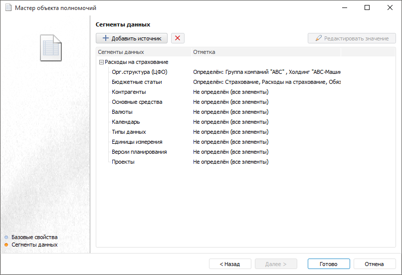 После определения базовых свойств объекта полномочий нажмите кнопку «Далее». Будет открыта следующая страница мастера «Сегменты данных»: