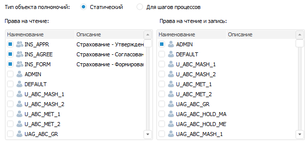 Примечание: Динамические права доступа задаются при создании шагов этапов процесса.