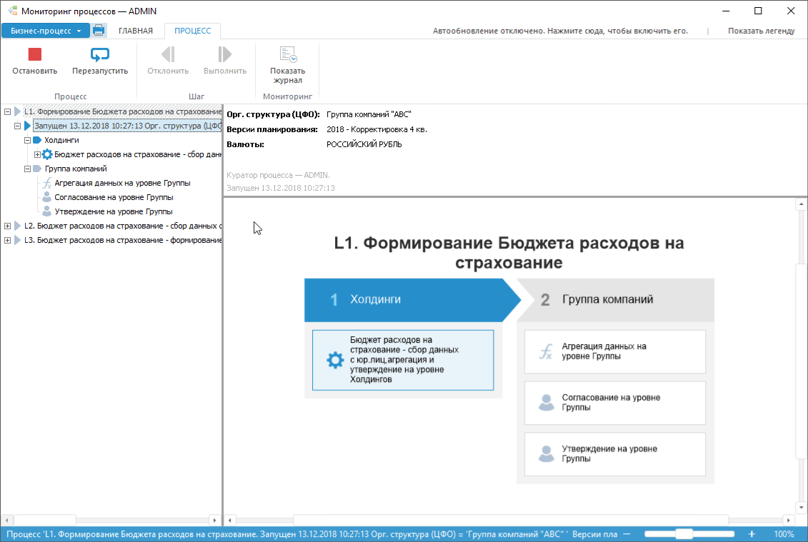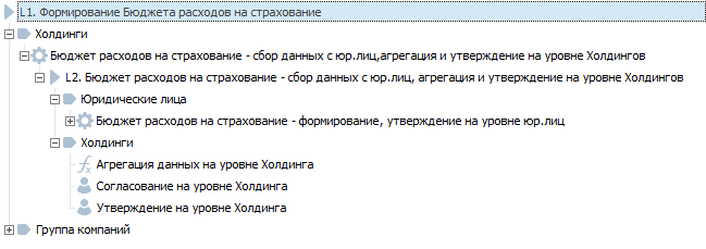 Для примера рассмотрим процесс с двумя вложенными подпроцессами: подпроцесс «Бюджет расходов на страхование – сбор данных с юр.лиц, агрегация и утверждение на уровне Холдингов» с ручным способом запуска на выполнение и подпроцесс для юридических лиц «Бюджет расходов на страхование – формирование, утверждение на уровне юр.лиц» с автоматическим способом: