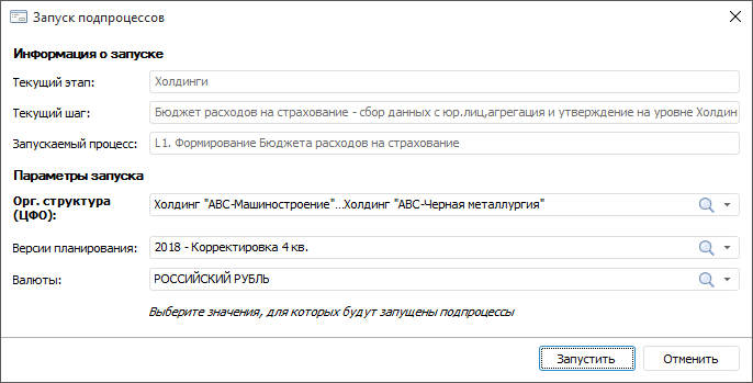 В окне «Запуск подпроцессов» в области «Параметры запуска» по умолчанию подставляются значения, для которых будут запущены подпроцессы: