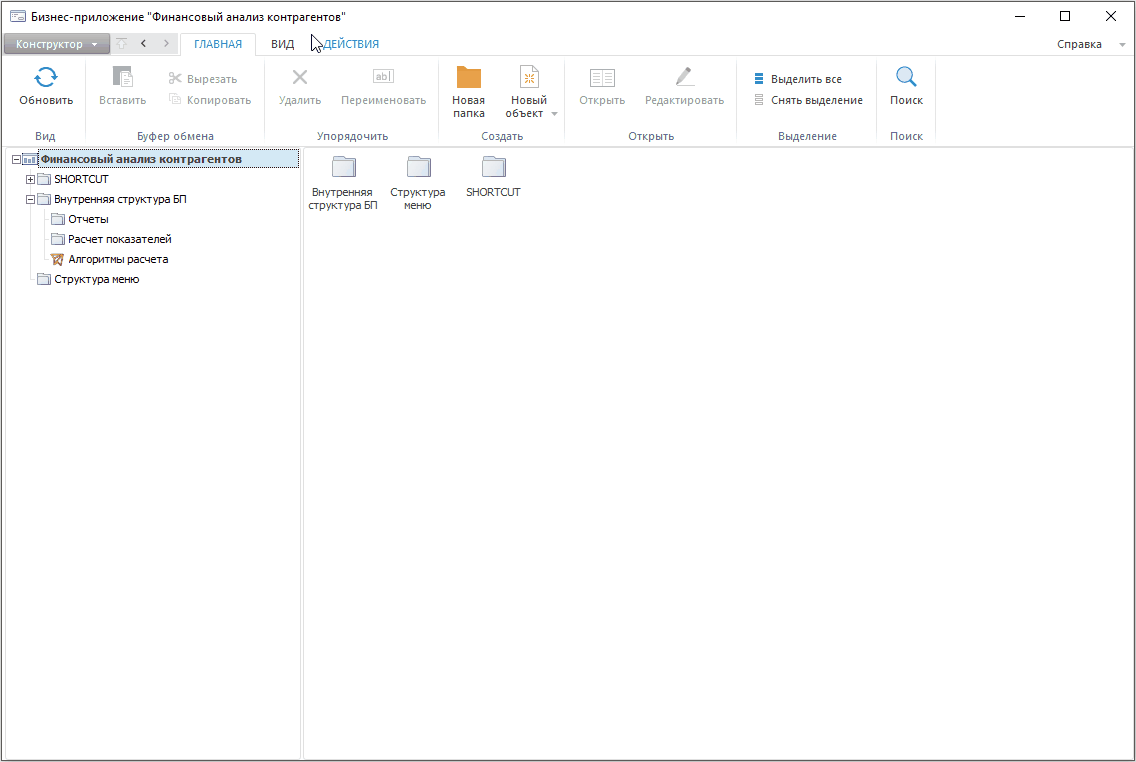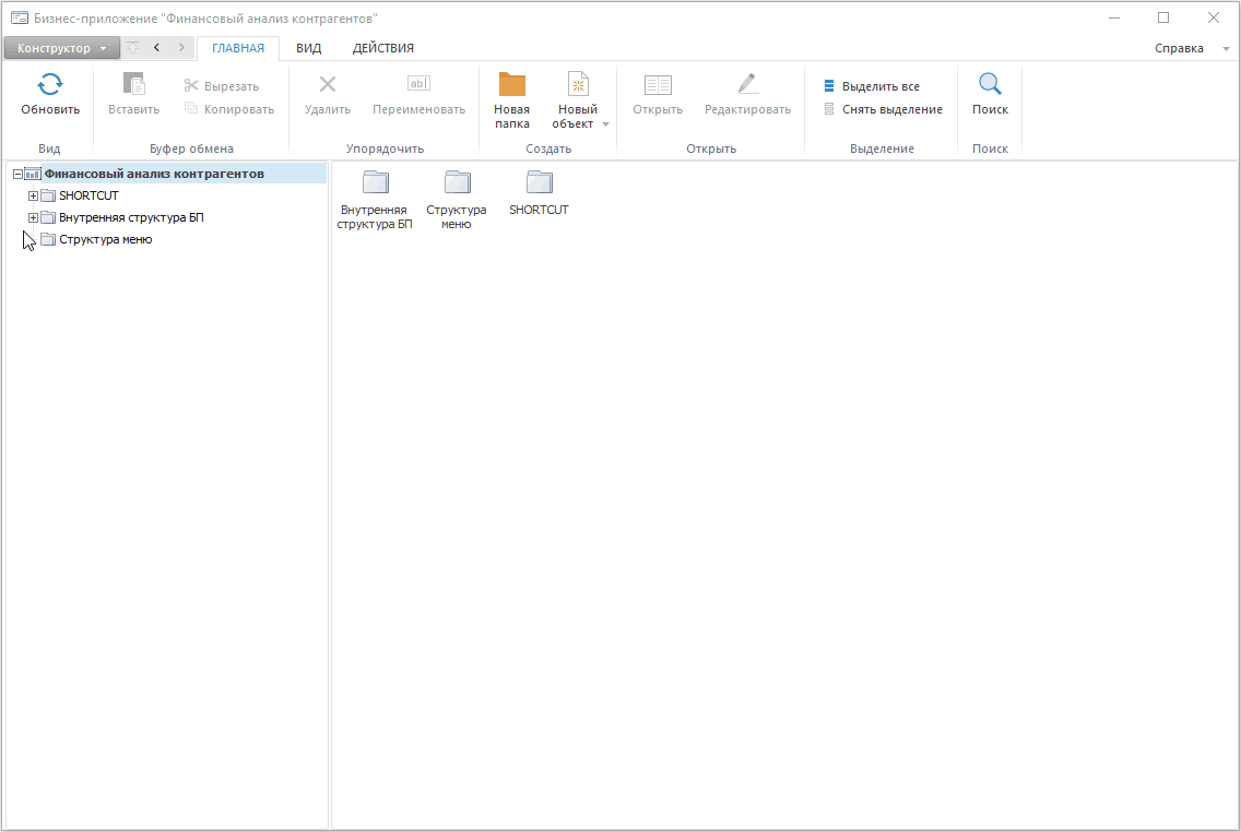 Построение бизнес-приложения выполняется в настольном приложении расширения «Конструктор бизнес-приложений» продукта «Форсайт. Аналитическая платформа».