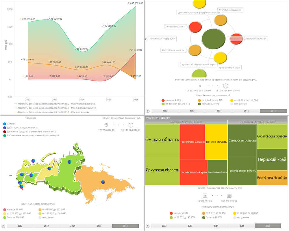 наличие взаимозаменяемых визуализаторов: таблиц, диаграмм, карт, индикаторов;