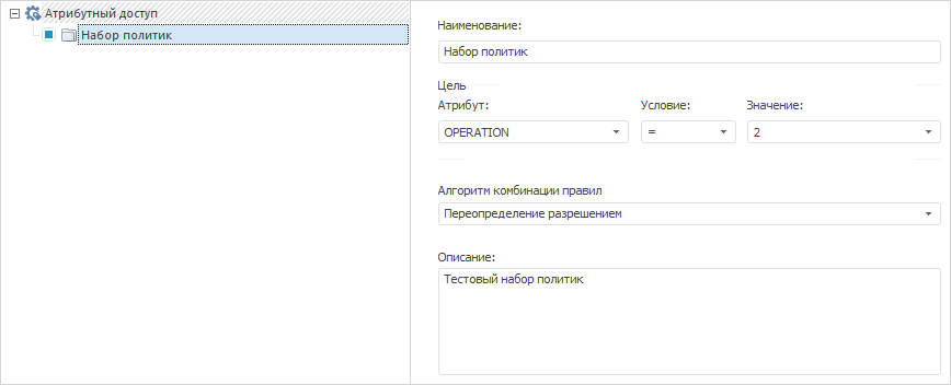 В результате выполнения примера в менеджере безопасности активируется использование атрибутного доступа, в котором будет добавлен и активирован набор политик с заданными параметрами: