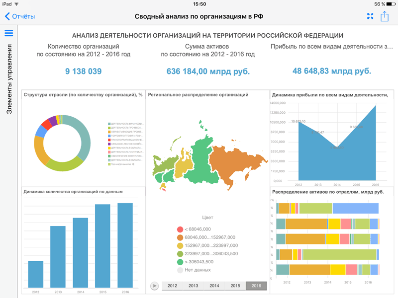 Инструмент «Аналитические панели» в мобильном приложении позволяет просматривать аналитические документы, созданные в настольном приложении, в виде комбинации интерактивных взаимосвязанных визуализаторов.