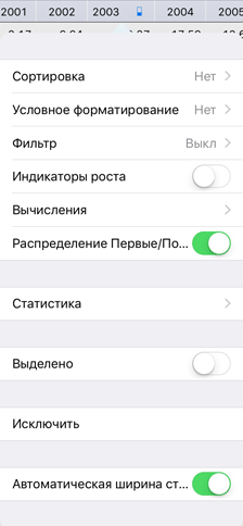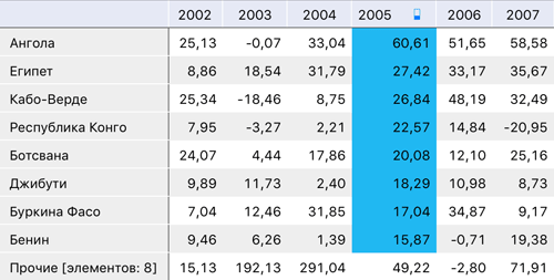 Создаваемые в мобильном приложении. Распределение применяется только для значений в одном столбце или в одной строке таблицы. Если настроить распределение для другого столбца/строки таблицы, то текущее распределение будет снято. После функции распределения процент наибольших значений от общей суммы будет выделен синим цветом, остальные значения будут просуммированы и агрегированы в один элемент «Прочие»: