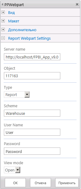 В правой части страницы появится боковая панель для настройки параметров веб-части. На вкладках «Вид», «Макет» и «Дополнительно» настраиваются стандартные параметры веб-части Microsoft SharePoint. Для настройки отображаемого отчета используйте вкладку «Report Webpart Settings»: