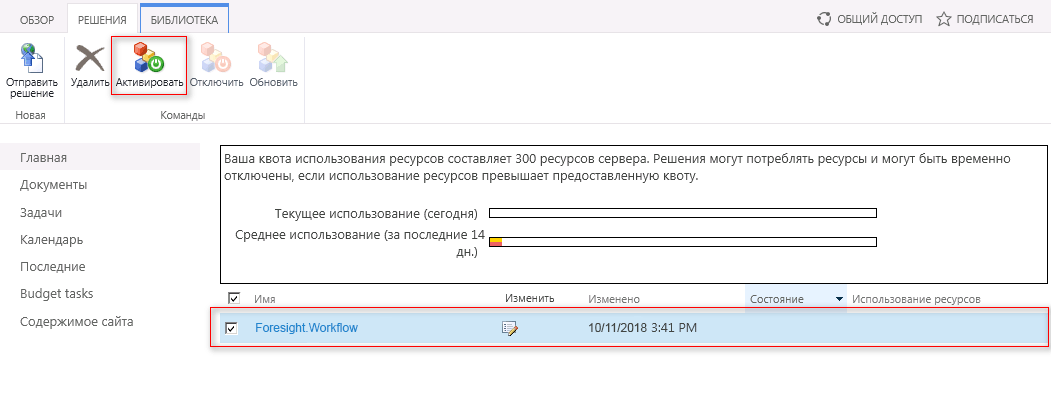 Для активации решения введите в адресной строке браузера <адрес портала>/_catalogs/solutions/Forms/AllItems.aspx. Будет открыта страница для работы с решениями. Выберите решение Foresight.Workflow из списка и нажмите кнопку «Активировать» на вкладке ленты «Решения»: