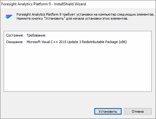 После нажатия кнопки «Установить» будет произведена попытка последовательной установки всех предлагаемых компонентов. Если необходимые пререквизиты отсутствуют в папке «ISSetupPrerequisites», то установка «Форсайт. Аналитическая платформа» будет остановлена и будет выдано соответствующее сообщение.