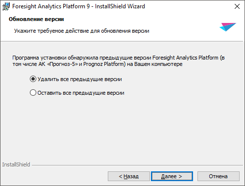 Удалить все предыдущие версии. Все имеющиеся более ранние версии Prognoz Platform и «Форсайт. Аналитическая платформа» будут удалены с компьютера;