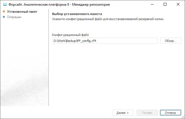 Укажите путь к конфигурационному файлу, который был использован для создания резервной копии. Процедура восстановления репозитория использует резервные копии, созданные при резервном копировании. Копии располагаются в той же папке, в которой находится конфигурационный файл.