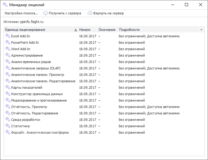 выполните команду «Справка > О программе» в главном меню продукта «Форсайт. Аналитическая платформа», затем нажмите кнопку «Изменить лицензии».