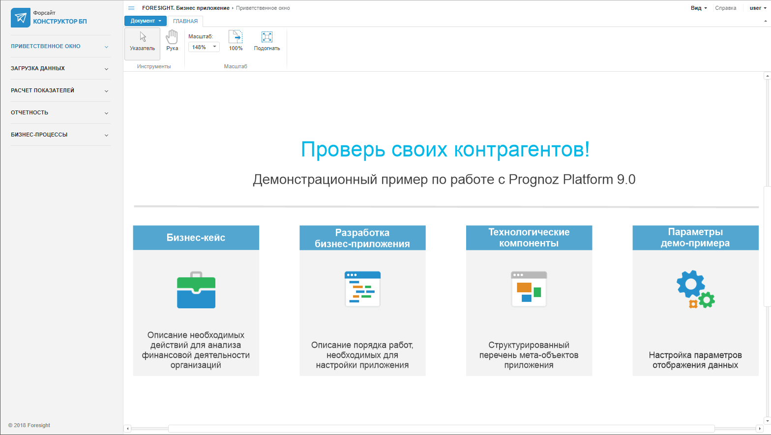 Объект «Бизнес-приложение Финансовый анализ контрагентов» предназначен для ознакомления с бизнес-приложением, созданным с помощью инструмента «Конструктор бизнес-приложений». Для открытия примера щелкните мышью по его названию в окне приветствия или откройте на просмотр в навигаторе репозитория. Пример будет открыт в режиме построения бизнес-приложения в настольном приложении инструмента: