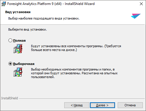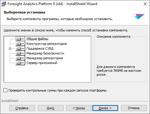 Примечание. Комплект поставки может включать папку, содержащую пререквизиты и msi-инсталляторы справочной системы. Особенности установки пререквизитов и справочной системы описаны в разделе «Комплект поставки «Форсайт. Аналитическая платформа»». Не допускается установка нескольких комплектов одного релиза.