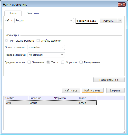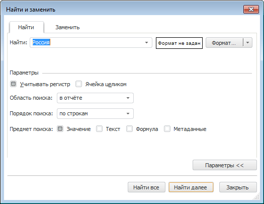 Примечание. По умолчанию поиск производится по всему отчету по строкам с учетом регистра, без учета формата искомых ячеек и других параметров. Поиск осуществляется по значению в ячейках таблицы.