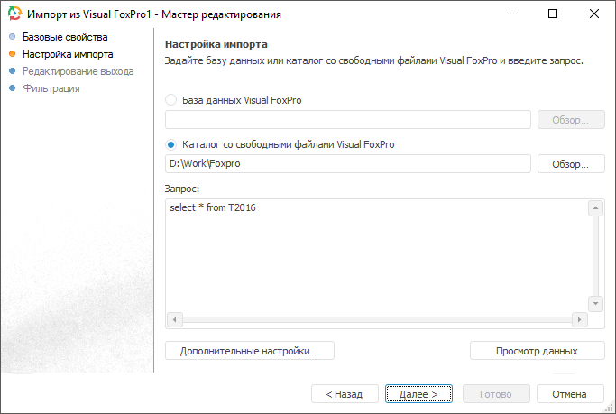 Переключатели «База данных Visual FoxPro» и «Каталог со свободными файлами Visual FoxPro» определяют тип источника.