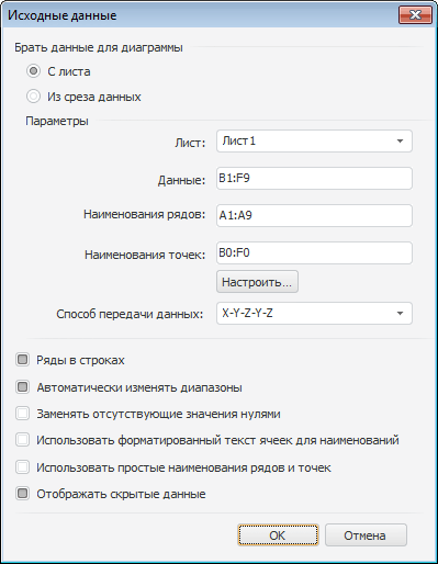 При создании диаграммы и редактировании исходных данных диаграммы открывается диалог «Исходные данные».